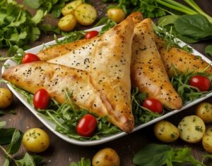 A golden, flaky pastry filled with a fragrant medley of spinach, green onions and tender potatoes. Served with our tangy chatni sauce.
